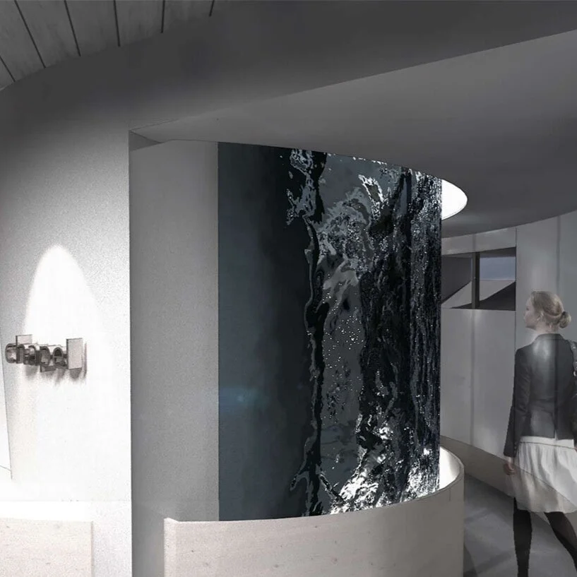 From the main hallway, the Chapel slowly emerges. Within a curved wall, a door beckons one to enter along a sweeping wall of illuminated panels. The elongated entry builds anticipation as to what may be found further within.